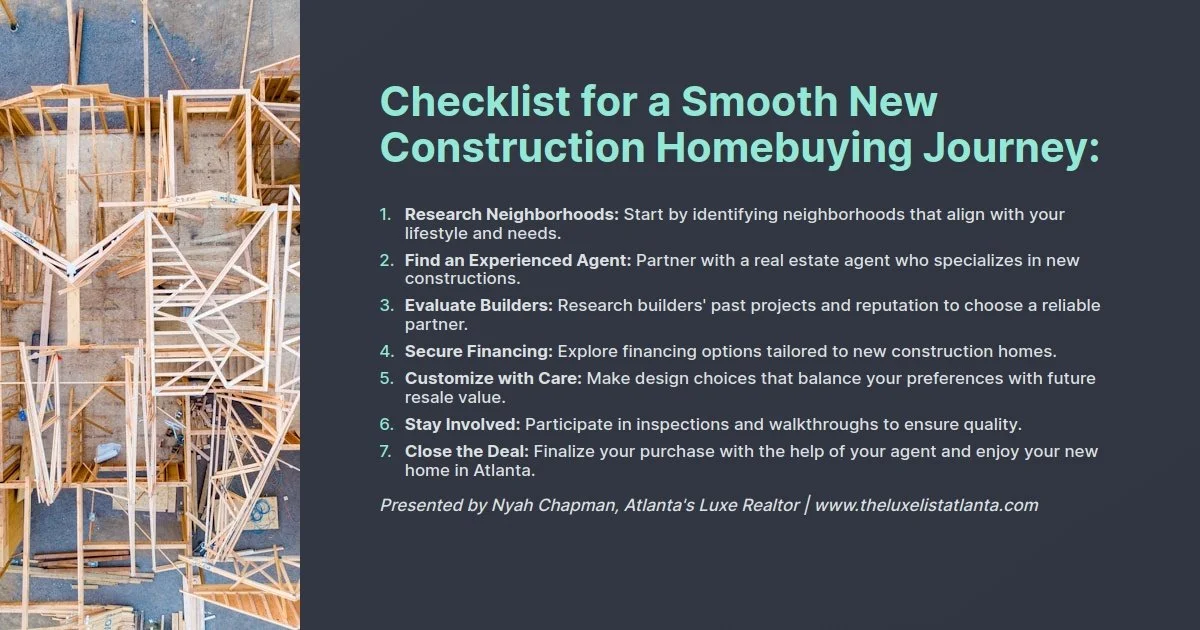 Working with a Real Estate Agent: Partner with Nyah Chapman, an agent experienced in Atlanta's new construction market. She can navigate the complexities of buying a new home, from negotiating the best deals to understanding the nuances of different neighborhoods. Her expertise ensures you find a home that meets your needs and fits your budget.