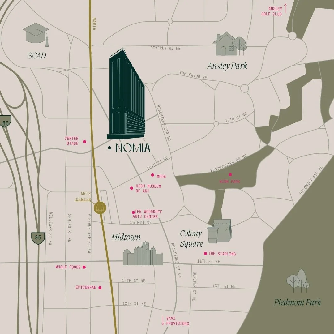 Emerging above the canopy of Peachtree Street, you'll discover a captivating blend of nature's splendor and city living. Extraordinary architectural marvels and refined interiors extend an invitation to join a community where life is an art form. With meticulous design and a host of tailored amenities, residing in style is second nature at Nomia.