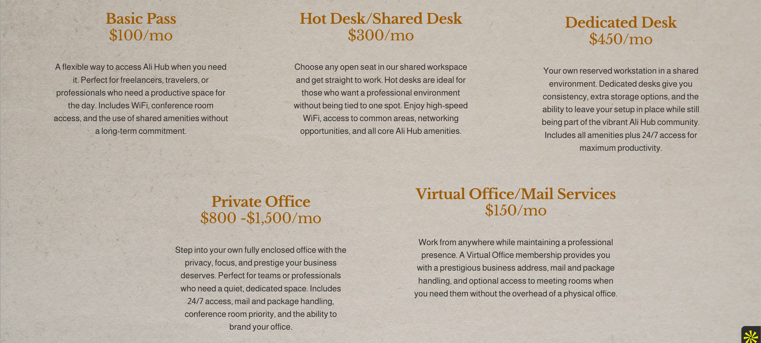 Whether you need a private office, a shared desk, or a dedicated space to host clients, Ali Hub is where productivity meets community.