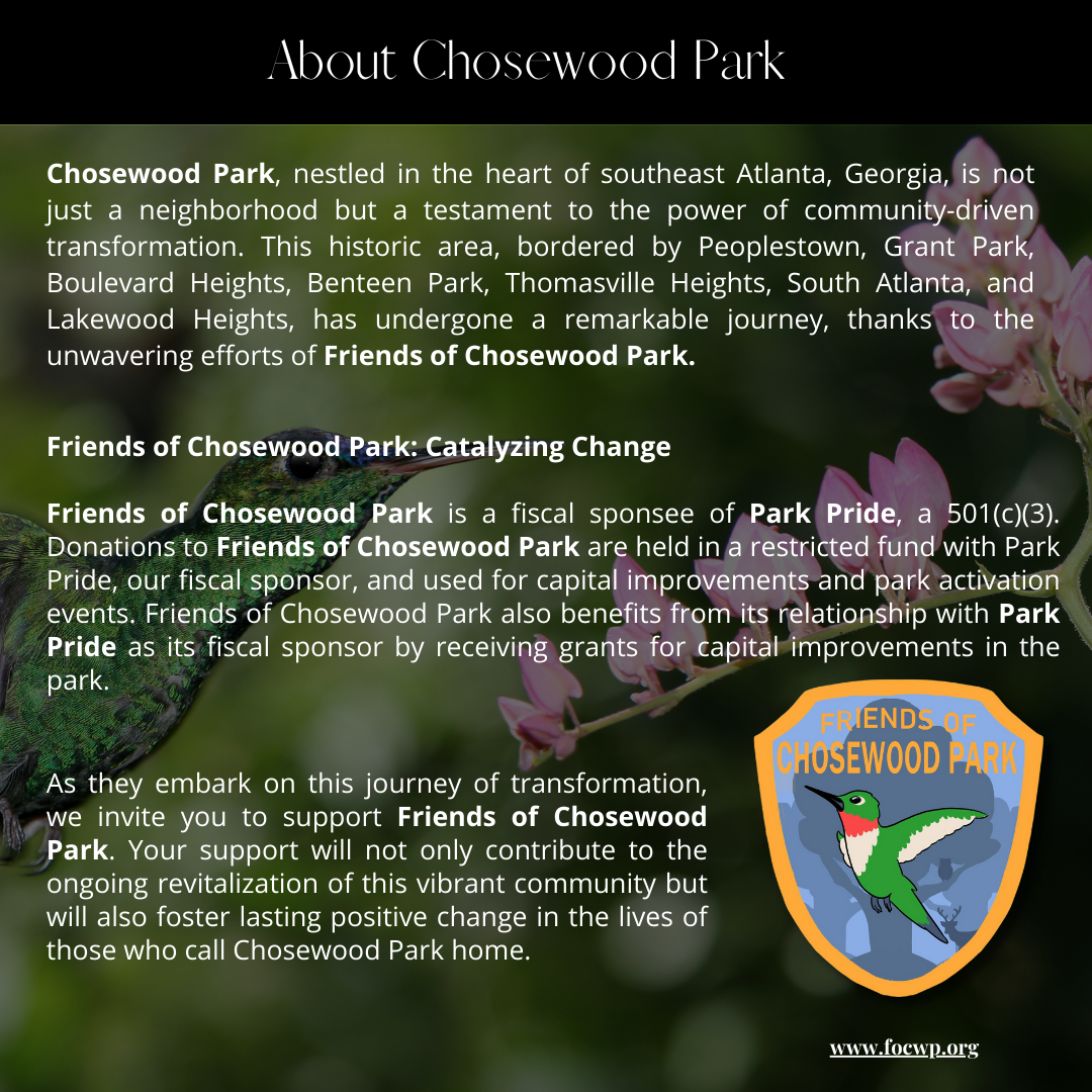 We will come together to celebrate and recognize the invaluable supporters of Friends of Chosewood Park and raise funds to further transform this neighborhood. Every contribution made during this magical evening becomes a seed planted in the soil of community growth, ensuring that Chosewood Park continues to flourish and inspire.